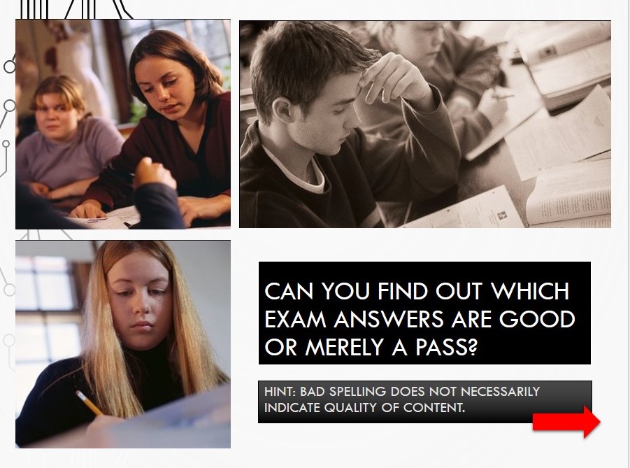 So first things first this can be created as a multiple choice quizz, we used written answers and then provided details of why these answers were good or not so strong. The emoticon or red cross out sign are for the student to vote if this was a strong or weak answer to an exam question.